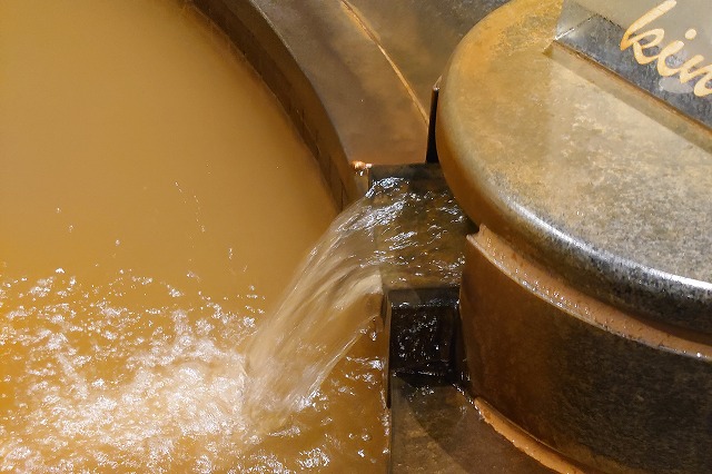 お湯そのものの印象は「太閤の湯」と基本的には同じ。金泉は2016年に娘と来た時はもっとオレンジ色が濃く、肌に付いた金泉のしずくがそのまま乾くと肌に色が残るほどだったが、今回はその頃と比べるとマイルドで薄くなったと感じる。