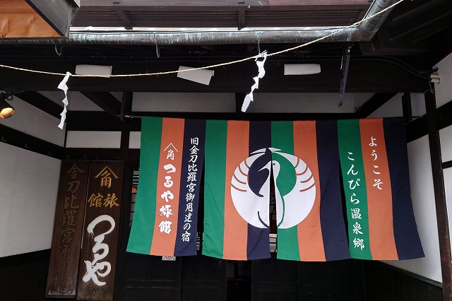 さて、こんぴら温泉つるや旅館は大きな土産物屋を併設する旅館で、芝居小屋風のデザイン。けっこう面白いところで私は嫌いじゃない。