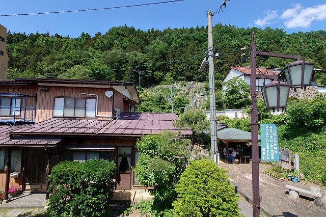 そもそも地図で見れば判るが、「政喜旅館」の道向かいに「温泉寺」があり(境内から実際に温泉が湧いている)、ここは山門を含めて温泉街の観光名所の一つと言ってよい。そのお寺を菩提寺とする人たちのお墓が横の斜面にあるのだが、それが見えると言えば見える。が、さっきも書いたように、かなり遠い。それに他のお部屋だって窓から角度的に見えないというだけで、距離は変わらないんだから私は気にならなかった。
