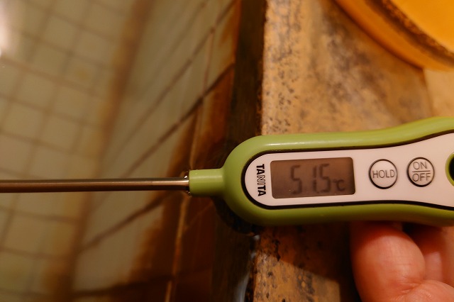 なんとか47度強ぐらいまで下げて入った。析出物が立派。少しだけ焦げ臭がする。肌に効きそう。でも長湯はとてもできない。この温度ではいたしかたない。そりゃそうだ、この温度だ。