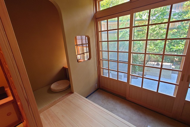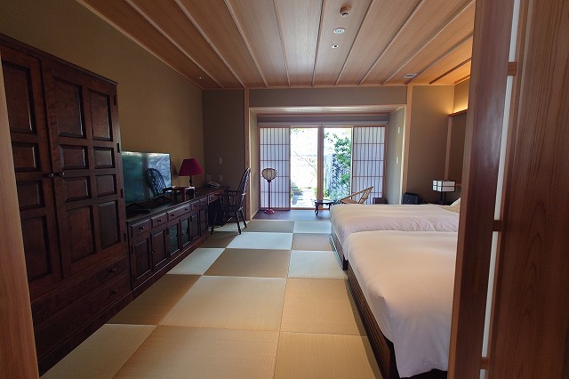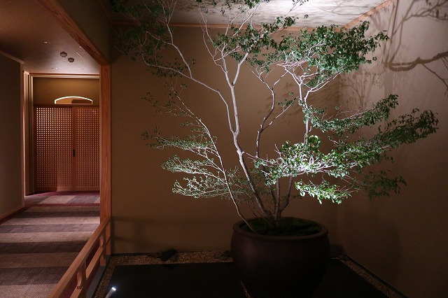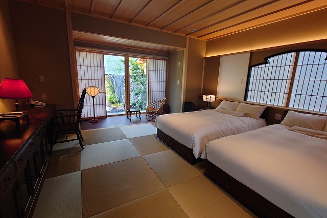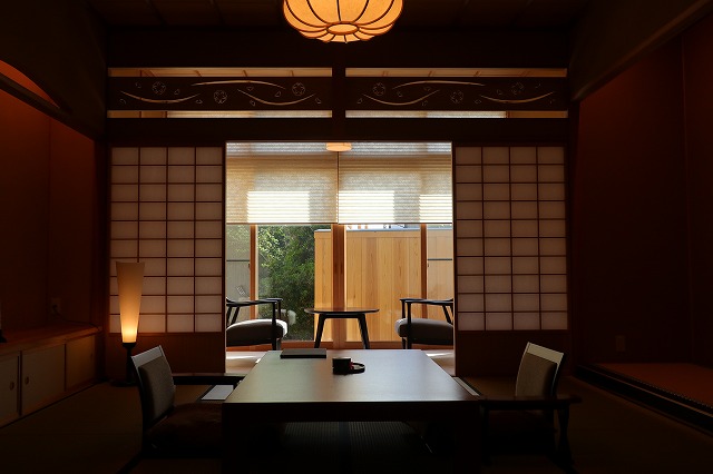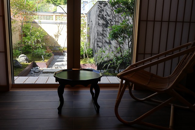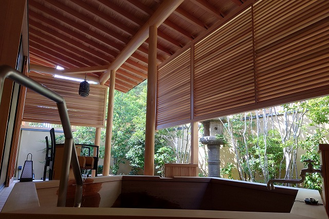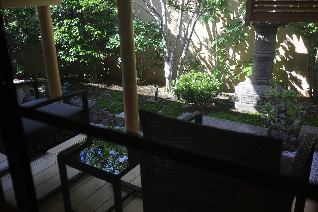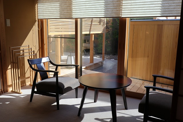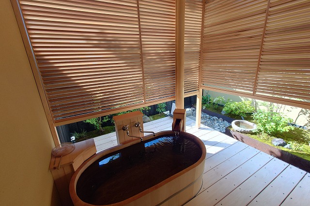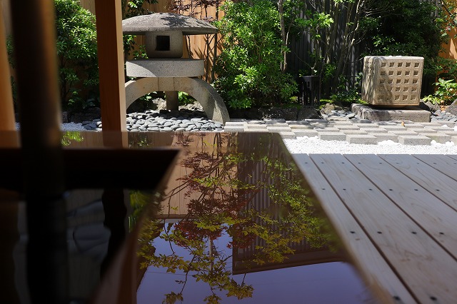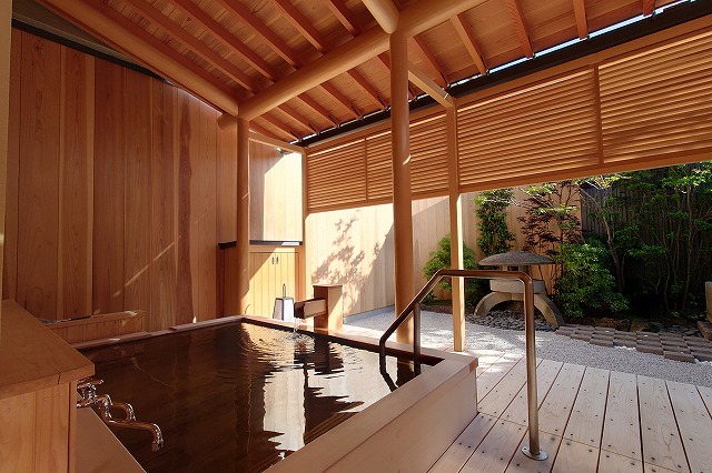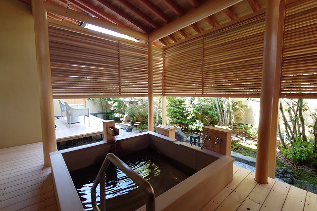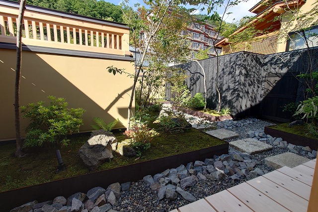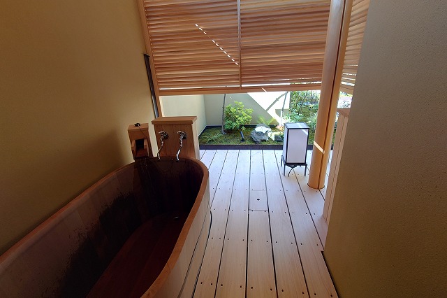 湯量は豊富で部屋の露天風呂は一晩中たっぷりと源泉が溢れる。部屋付き露天風呂は小ぢんまりとしているところが多いが、ここはどのお風呂も2~3人がゆうゆう入れるサイズ。坪庭も付いていて一つの完結した世界観を持っている。