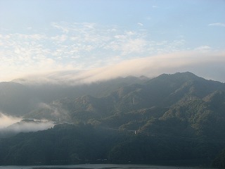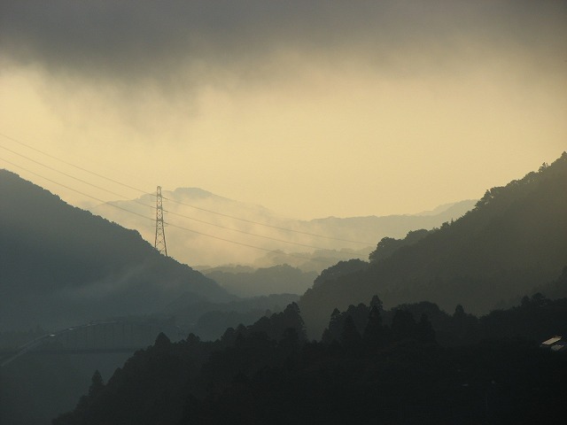 ちょうど甲府盆地の東側、笛吹川とその支流が作り出した平地を挟み、対岸に盆地と富士五湖の間にそびえる山地が見えていて、その山の間から小さく富士山が端麗な顔を覗かせている。