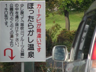 第一駐車場の入り口を過ぎた目の前に『カーナビが間違いです ほったらかし温泉 少し戻って「笛吹川フルーツ公園」の中を通り抜けて下さい。公園内「ぷくぷくの湯」より1キロ先です』と書かれた看板があり、その文字の下に右側に矢印の矢の着いた下向きのUターンマークが書かれていた。