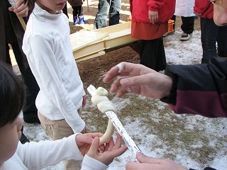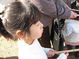 なかなか集まらない子供たちをようやくホールの前に連れていくと、係りのおじさんが先の方に白いものをつけた棒を配っている。