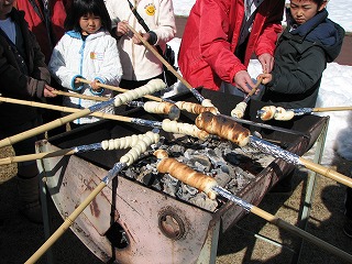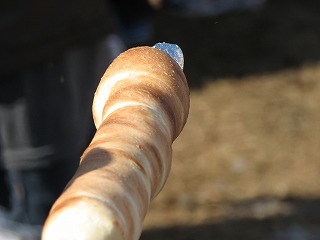 棒の先についているのはパンの元で、これを伸ばして棒にくるくると巻き付けて自分たちで焼くらしい。
